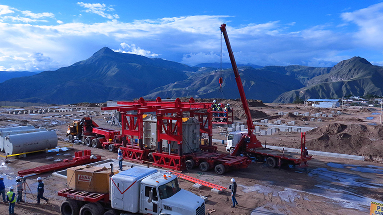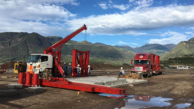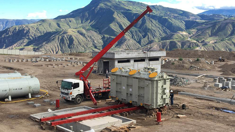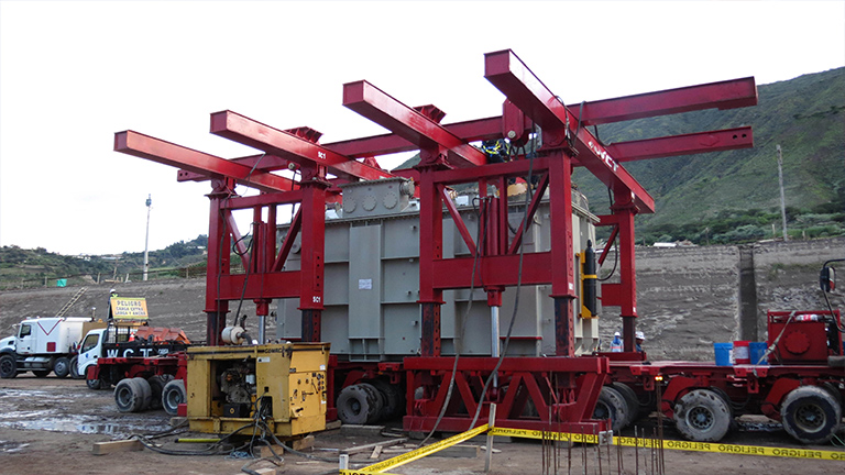 Pero esta operación no acabó al llegar a Pimampiro. Una vez llegó la carga empezó el proceso final de este proyecto, la descarga y colocación del transformador en el punto acordado dentro de la subestación. Días antes de la llegada del convoy a la subestación de Pimampiro, otra parte del equipo se ocupó del armado de la Grúa Gantry, una estructura desmontable que funciona con gatos hidráulicos de gran capacidad para llevar a cabo el levantamiento del transformador. Una vez levantado el transformador retiramos la plataforma modular y fue apoyado en 6 bancadas de madera. Tras esa operación, colocamos los patines sobre rieles que servirían para llevar el transformador hasta su sitio. Para esta operación utilizamos gatos hidráulicos específicamente para gateo. La duración total de este proyecto, con el traslado y posicionamiento del transformador en su destino final, fue de unos 20 días.